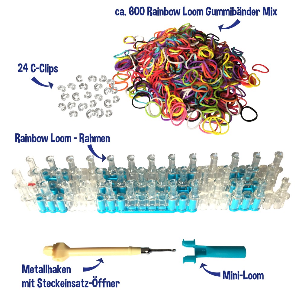 Dieses Rainbow Loom® Starter-Set enthält: 1 Loom (Web-Rahmen), 1 Rainbow Loom® Metallhaken mit Steckeinsatz-Öffner, 1 Mini-Loom, ca. 600 bunte Original Rainbow Loom® Gummibänder (Mix) und 24 C-Clips. Rainbow Loom® Gummibänder sind latexfrei, BPA-frei, bleifrei und Phthalate-frei.